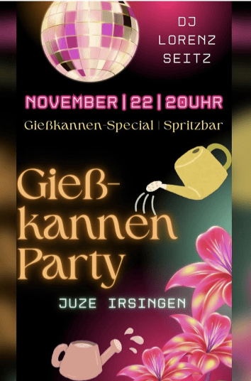 Der Jugend- und Brauchtumsverein lädt euch ganz herzlich zur Gießkannen-Party in das JuZu irsingen ein. DJ Lorenz Seitz wird euch musikalisch ordentlich einheizen.